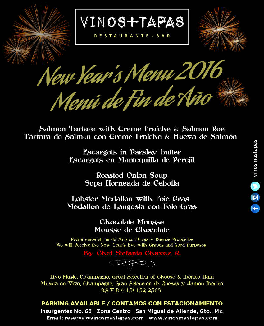 *Sábado 31 de diciembre abierto con nuestro menú y a partir de las 8:00 p.m la celebración de fin de año para reservaciones Tel 1522563 reserva@vinosmastapas.com